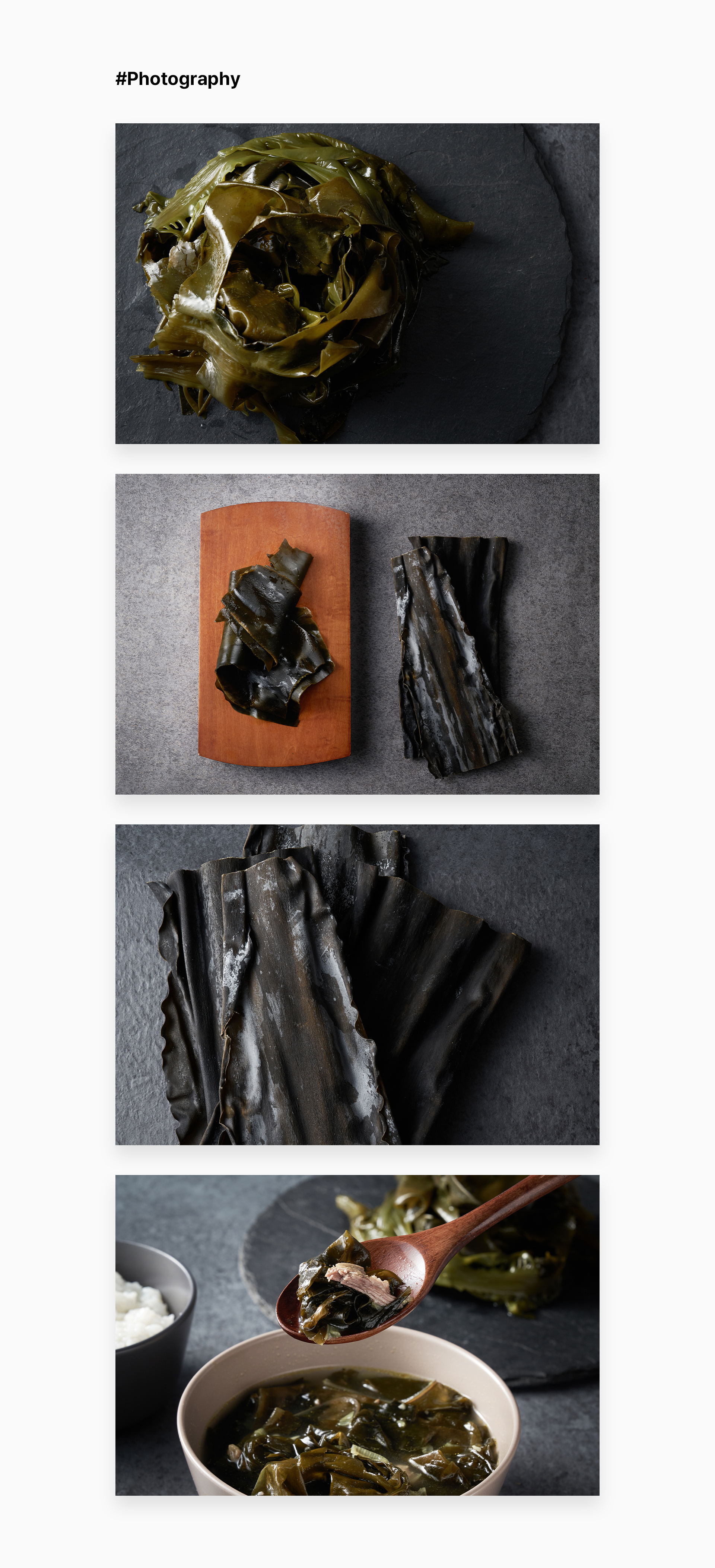 옹진자연의 입점업체 백령도두무진농수산물판매장의 '백령도 자연산 돌미역·돌다시마' 제품을 촬영하였습니다. 미역, 다시마를 활용할 수 있는 미역국 등 여러가지 조리된 모습까지 컨셉촬영 하였습니다.